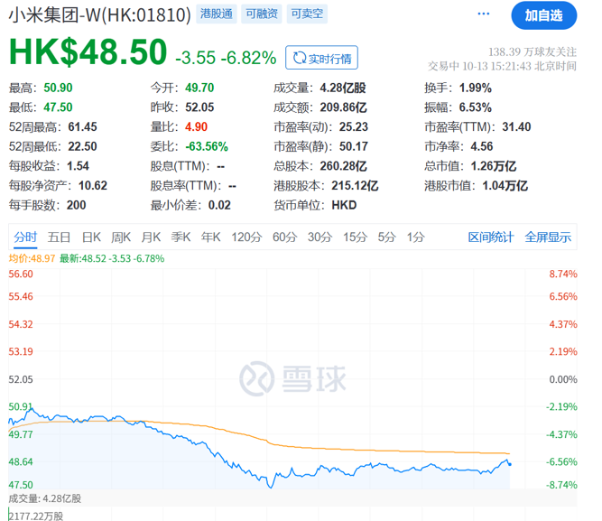 小米股价大跌近7%,消息面上,10月13日凌晨,四川成都天府大道主干道,一辆小米SU7在行驶中发生碰撞后起火燃烧,多人合力救援未能打开SU7车门。