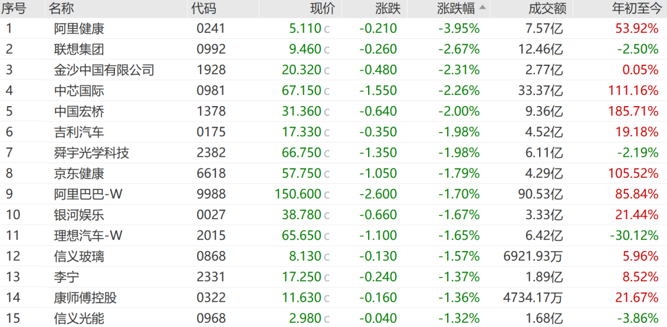 跌幅方面,阿里健康下跌3.95%,联想集团下跌2.67%,金沙中国有限公司下跌2.31%。