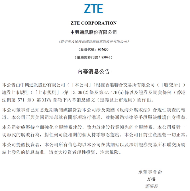 中兴通讯表示,公司始终坚持全面强化合规体系建设,致力于建设行业领先的合规体系。公司反对一切形式的腐败行为,对任何可能相关的个人持零容忍态度。公司目前生产经营一切正常。