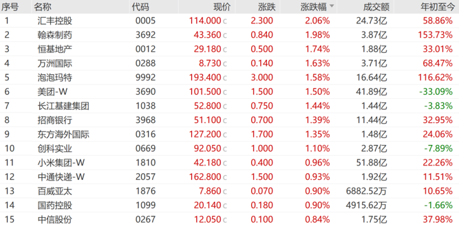 恒生指数成份股中,37只上涨,50只下跌。汇丰控股上涨2.06%,翰森制药上涨1.98%,恒基地产上涨1.74%,领涨蓝筹股。