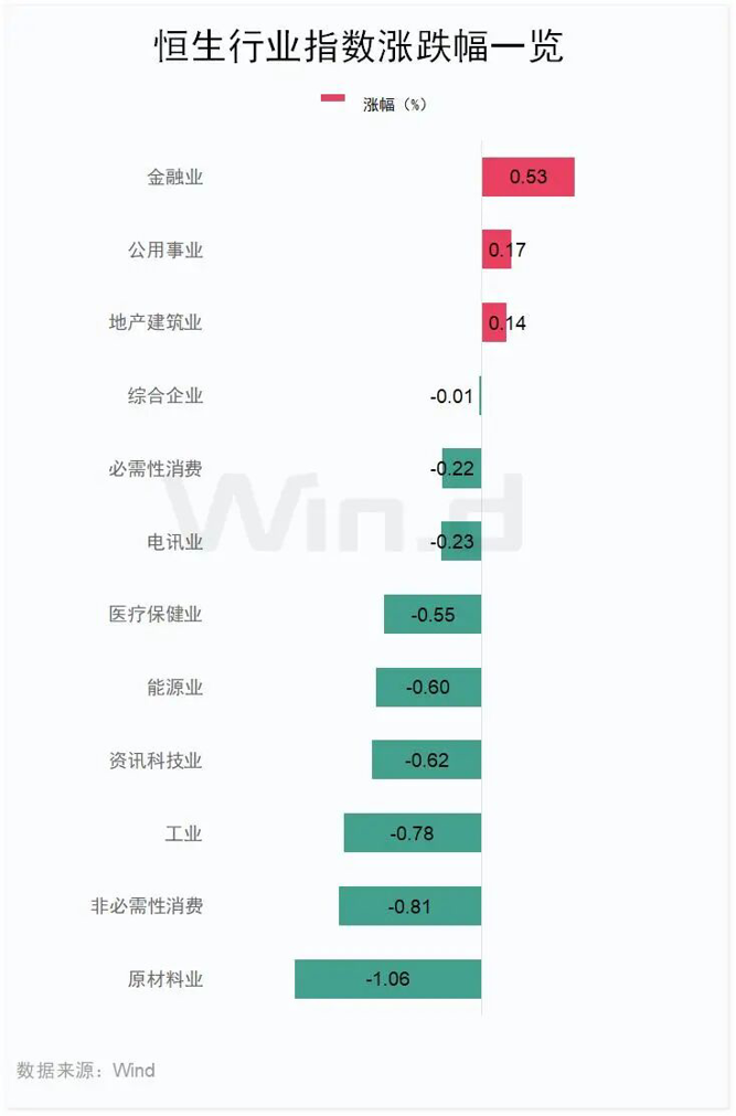 香港恒生行业指数中,金融业指数上涨0.53%,公用事业指数上涨0.17%,地产建筑业指数上涨0.14%;跌幅方面,原材料业指数下跌1.06%,非必需性消费行业指数下跌0.81%,工业指数下跌0.78%。