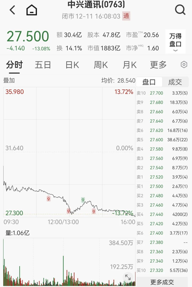 12月11日,受“黑天鹅”事件影响,中兴通讯低开低走,一度大跌13.72%,全天收于27.50港元/股,跌13.08%。