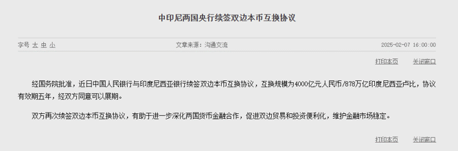 2月7日,中国人民银行与印度尼西亚银行续签双边本币互换协议,互换规模为4000亿元人民币/878万亿印度尼西亚卢比,协议有效期五年,经双方同意可以展期。