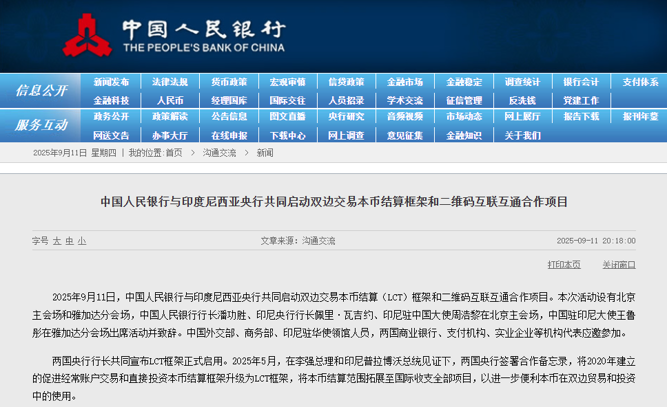 9月11日晚间,央行官网消息显示,中国人民银行与印度尼西亚央行共同启动双边交易本币结算(LCT)框架和二维码互联互通合作项目。