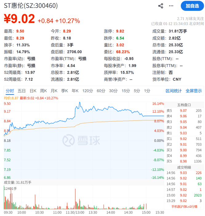 截至1月12日收盘,ST惠伦股价为9.02元/股,总市值为25.33亿元。