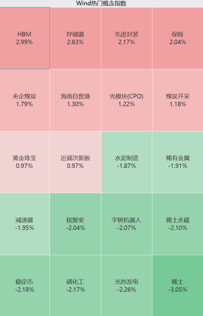盘面上,上午煤炭、通信、医药生物等板块保持热度,HBM、存储器、先进封装、保险等概念股活跃;发电设备、多元金融、钢铁等板块走低,稀土、稳定币、宇树机器人等概念股回调。