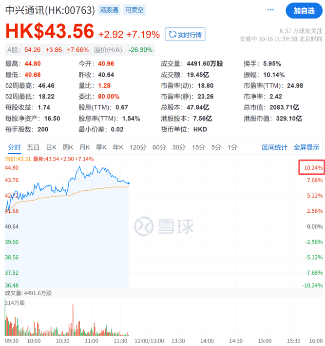 中兴通讯A股盘中一度逼近涨停,中兴通讯港股一度涨超10%。