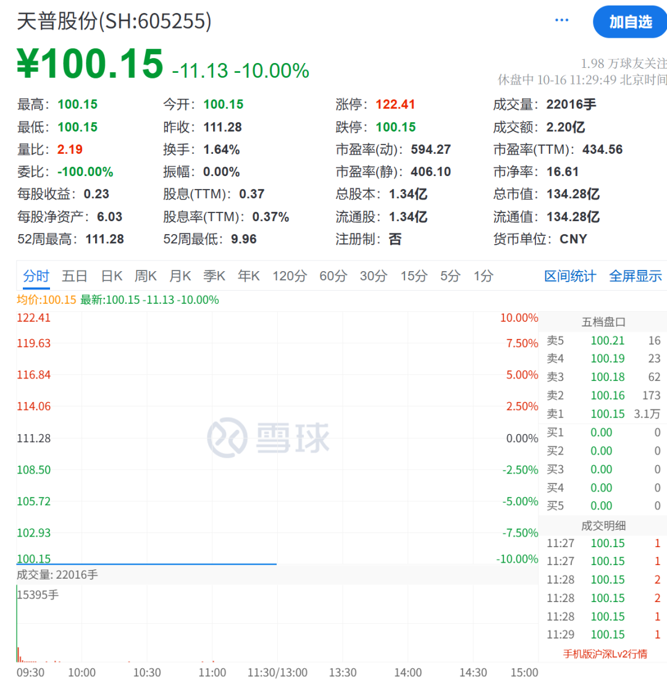 10月16日,前期曾“15连板”的牛股天普股份开盘跌停,报100.15元/股,跌幅为10%。截至午间收盘,天普股份保持一字跌停状态。