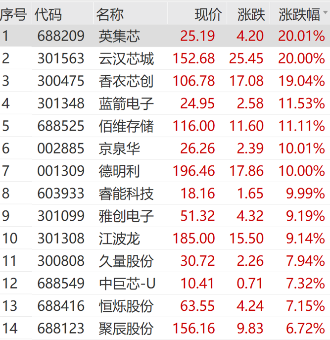 个股方面,截至午间收盘,英集芯、云汉芯城走出20cm涨停,京泉华、德明利、睿能科技等涨停,佰维存储、蓝箭电子等涨超10%。