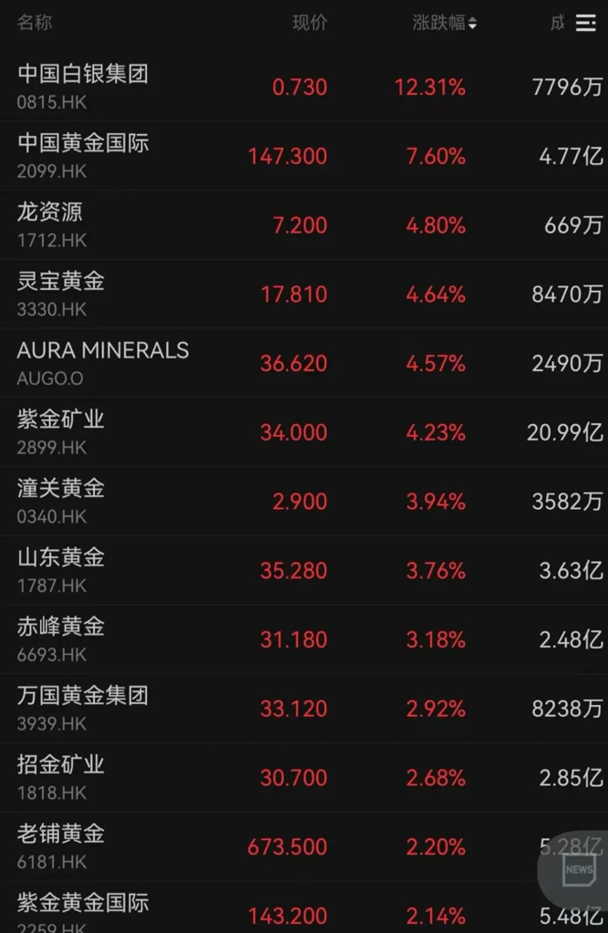 COMEX黄金期货日内突破4200美元/盎司,港股黄金股走高。中国白银集团涨超12%,中国黄金国际、灵宝黄金、紫金矿业分别上涨7.60%、4.64%、4.23%。
