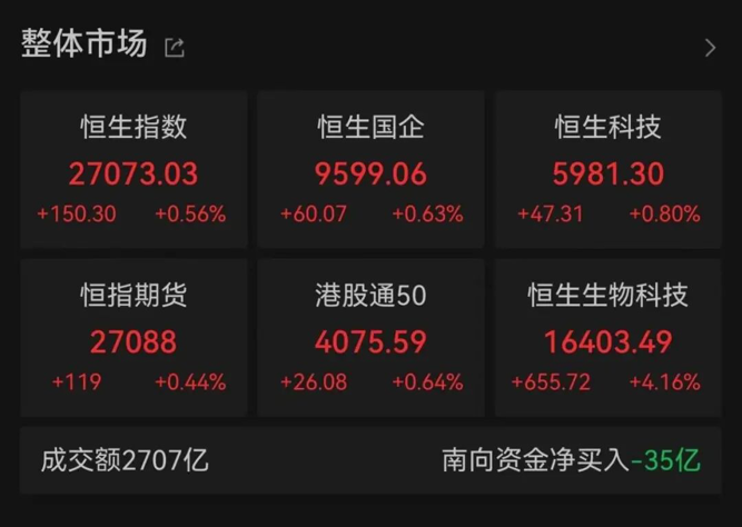 港股三大指数今日再度收涨。截至收盘,恒生指数上涨0.56%,报27073.03点;恒生科技指数上涨0.80%,报5981.30点;恒生国企指数上涨0.63%,报9599.06点。