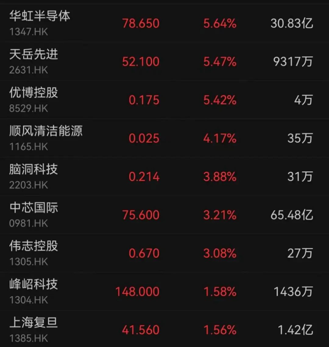半导体芯片股午后同样转涨,龙头华虹半导体、中芯国际、上海复旦分别上涨5.64%、3.21%、1.56%。