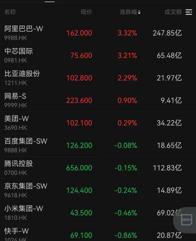 阿里巴巴收涨3.32%,网易、美团分别收涨0.90%、0.29%;百度、腾讯、京东等跌幅收窄。