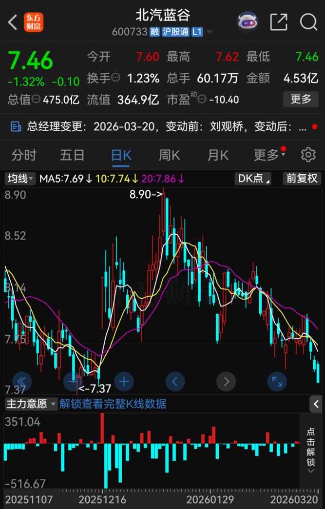 3月20日收盘,北汽蓝谷股价报7.46元/股,跌幅达1.32%,总市值为475亿元。