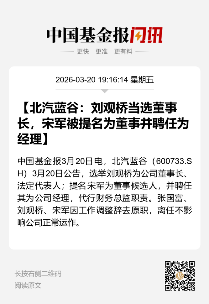3月20日晚间,北汽蓝谷发布公告称,公司近日收到董事长张国富、经理刘观桥,以及职工董事、常务副经理、财务总监宋军提交的书面辞职报告。