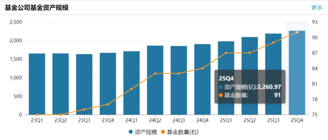 Wind数据显示,2021年,农银汇理基金管理规模达到2600多亿元的峰值,之后大幅缩水,一度徘徊在1600多亿元。近年来,公司在管规模稳步攀升,截至2025年末,基金资产规模达2260.97亿元。