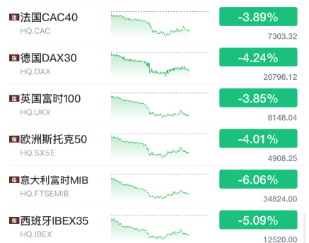 欧洲股市普遍跌超4%,原油暴跌8%。