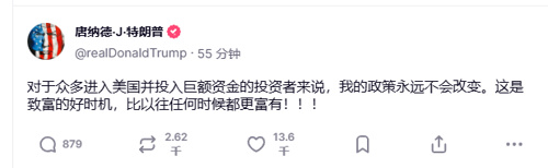 特朗普周五在社交媒体上发布:“对于那些纷纷涌入美国、投资巨资的投资者们来说,我的政策永远不会改变。现在是发财的大好时机,比以往任何时候都更容易致富!!!”