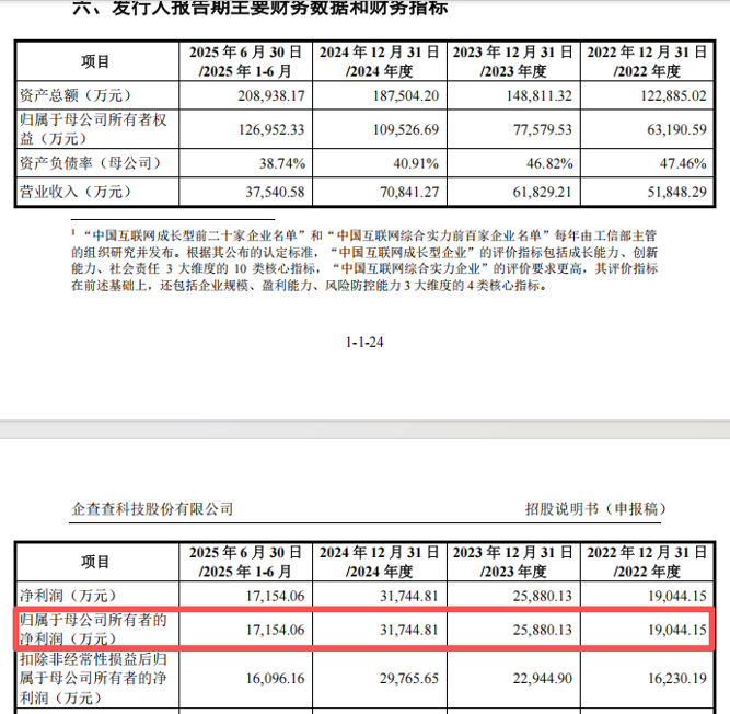 2022年至2024年及2025年上半年,企查查的营业收入分别为5.18亿元、6.18亿元、7.08亿元及3.75亿元,归母净利润分别为1.90亿元、2.59亿元、3.17亿元和1.72亿元。