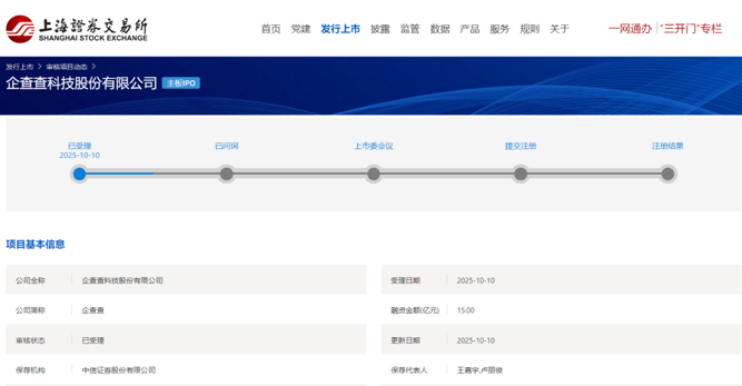上交所官网显示,10月10日,企查查科技股份有限公司(以下简称企查查)申报上交所主板IPO已获受理,保荐机构为中信证券股份有限公司、会计师事务所为容诚会计师事务所(特殊普通合伙)。