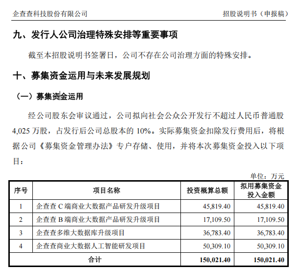 招股书(申报稿)显示,企查查此次IPO拟公开发行不超过4025万股股份,占其发行后总股本的10%,募资总额约为15亿元。