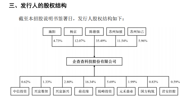 招股书(申报稿)显示,企查查当前的控股股东、实控人为陈德强,后者直接持股比例为35.49%,通过苏州知彼信息科技中心(有限合伙)间接控制11.54%的股份、通过苏州知已网络科技中心(有限合伙)间接控制5.96%的股份,合计持股比例达53%。