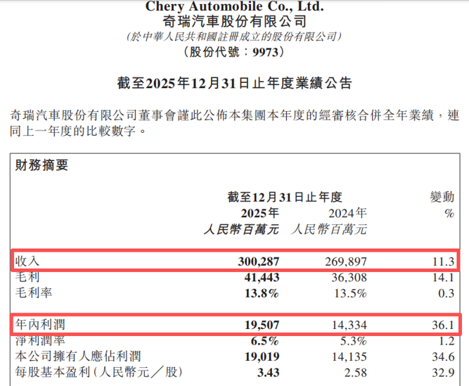 年报显示,奇瑞汽车2025年的总营收首破3000亿元大关,达3002.9亿元,同比增长11.3%;净利润为195.1亿元,同比增长36.1%。