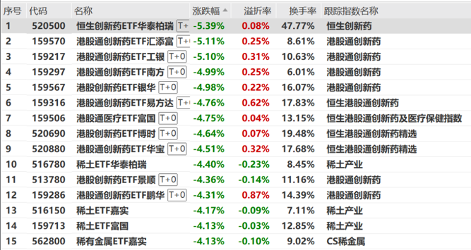 港股创新药、有色稀土板块深度回调,相关ETF跌幅居前。