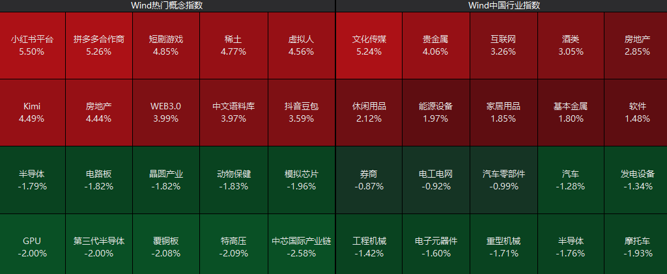 从板块来看,贵金属、有色板块再度拉升,AI应用方向、房地产、稀土等板块表现活跃;而半导体、电子元器件、工程机械等板块跌幅居前。