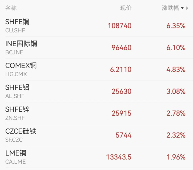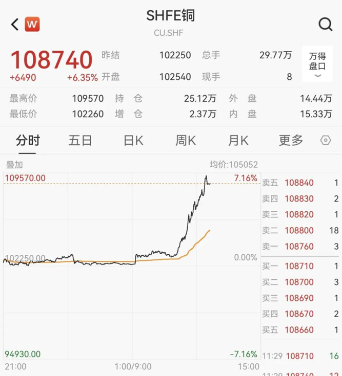 消息面上,沪铜主力合约日内涨超6%,突破10.8万元/吨,再创历史新高。