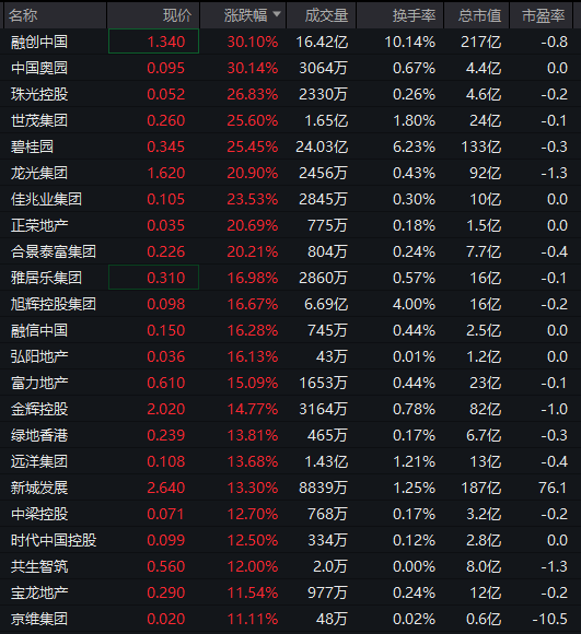 港股房地产股走强,融创中国涨超30%,碧桂园、龙光集团涨超20%。