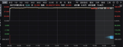 中慧生物-B港股上市首日报收于33.28港元/股,较招股价高出157.98%。全日成交量为899.28万股,成交额为2.98亿港元,最新总市值为130.94亿港元。