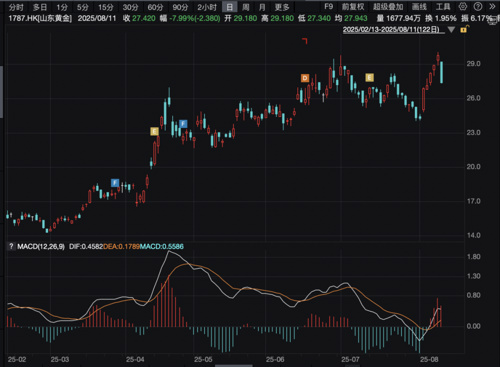 8月11日,黄金股全线下跌。其中,山东黄金跌7.99%,赤峰黄金跌6.86%,招金矿业跌4.77%,潼关黄金跌4.46%。