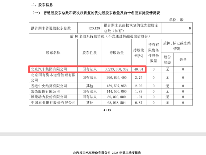 北汽集团是福田汽车的控股股东。截至2025年第三季度末,北汽集团直接持有福田汽车40.84%的股份。