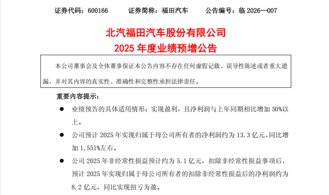 1月30日,福田汽车发布业绩预告称,预计公司2025年的归母净利润约为13.3亿元,同比增长1551%;扣非后净利润为8.2亿元,同比实现扭亏为盈。