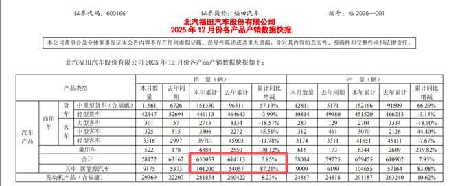 2025年,福田汽车的新能源汽车销量达10.12万辆,同比增长87.21%;海外市场整车销量达16.45万辆,同比增长7.27%。
