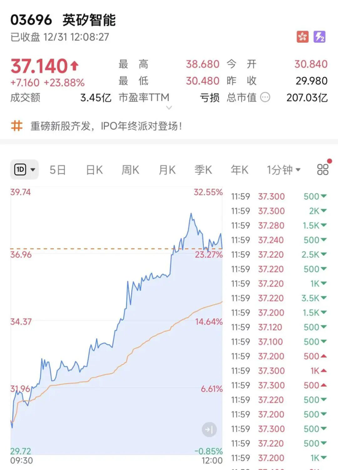 12月31日,英矽智能上市次日大涨近24%,较招股价涨近四成,总市值突破180亿港元。