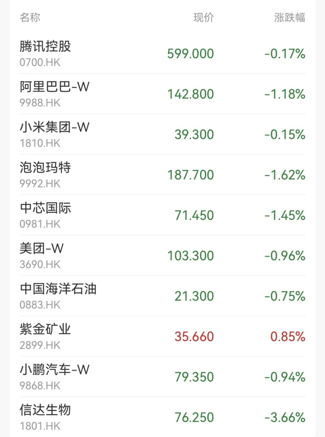 盘面上,大型科技股多数走低,京东集团、阿里巴巴跌超1%;互联网医疗股走低,京东健康、平安好医生、阿里健康跌超1%;汽车股走弱,零跑汽车跌近3%,比亚迪股份跌超2%;保险股、半导体股、生物技术股等多数下跌。