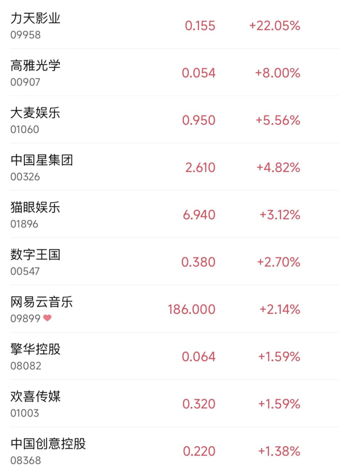 12月31日,港股影视娱乐股上扬,截至收盘,大麦娱乐涨近6%,中国星集团涨近5%,猫眼娱乐涨超3%。