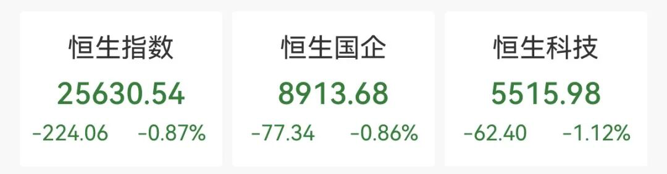 12月31日,港股2025年最后一个交易日,三大指数微跌。截至收盘,恒生指数报25630.54点,下跌0.87%;恒生国企指数报8913.68点,下跌0.86%;恒生科技指数报5515.98点,下跌1.12%。