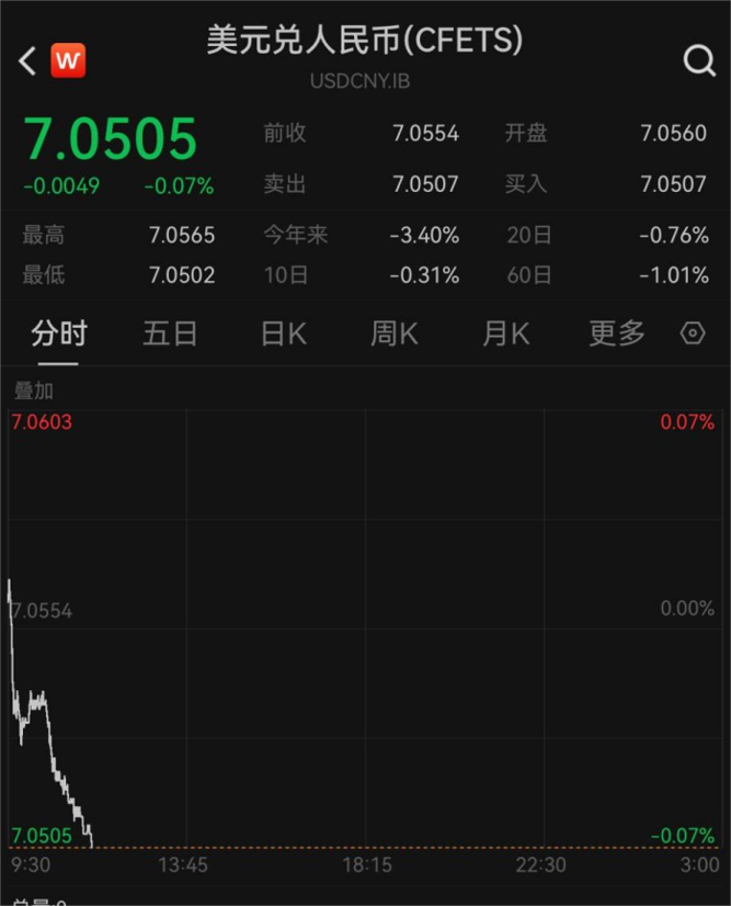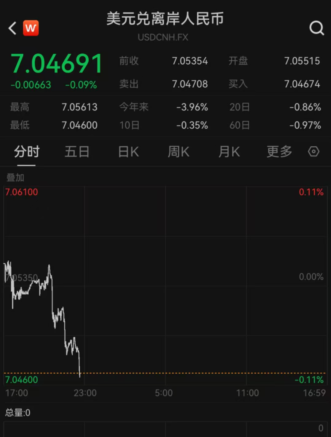 离岸人民币兑美元汇率再度升破7.05,创2024年10月3日以来新高。截至发稿,报7.04691。