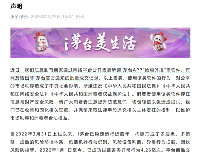【导读】一个月拦截异常4.26亿次,i茅台发布关于“外挂抢购”的声明
