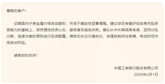 2月1日,工商银行发布消息称,近期国内外贵金属价格波动剧烈,市场不确定性显著增强。建议投资者在审慎评估自身风险承受能力的基础上,保持理性投资心态,避免盲目追涨杀跌。建议从中长期视角考虑,坚持分批分散、适度均衡的原则进行投资配置。请投资者密切关注行情变化,合理控制持仓规模,有效防范市场波动风险。