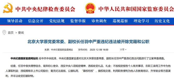 12月8日,中央纪委国家监委官网通报:北京大学原党委常委、副校长任羽中严重违纪违法被开除党籍和公职。