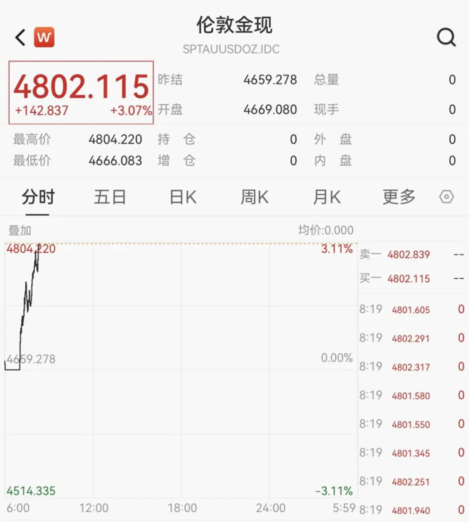 【导读】现货黄金开盘反弹,重回4800美元