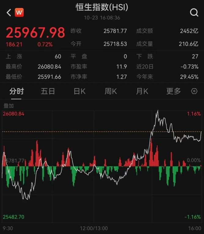10月23日,港股三大指数全天震荡,午后发力,涨幅扩大。