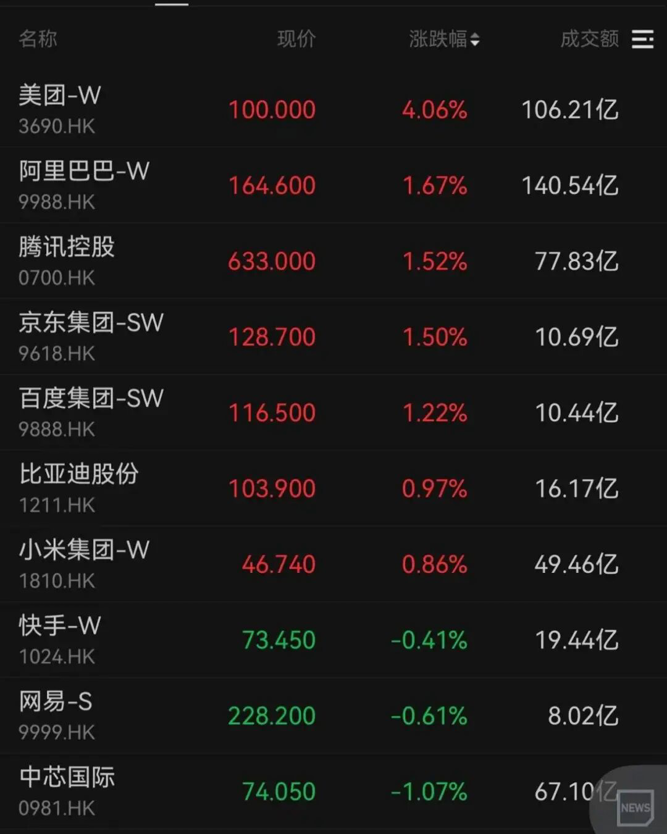 其余科网股中,阿里巴巴、腾讯、京东、百度涨幅超过1%,快手、网易和中芯国际均下跌。