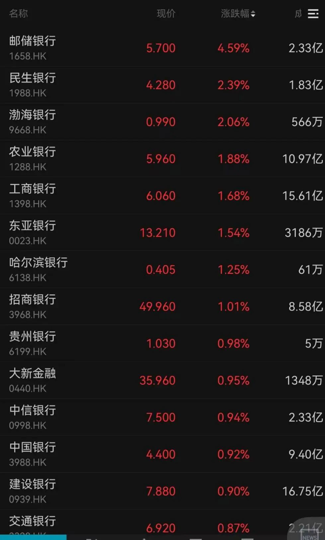 内资银行股再受资金青睐。邮储银行、民生银行、渤海银行等分别上涨4.59%、2.39%、2.06%;农业银行收涨1.88%,已连续11日收涨。