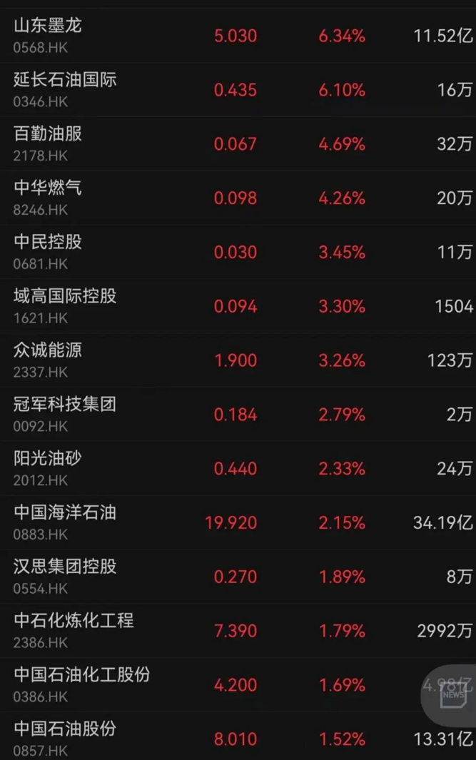 山东墨龙、延长石油国际涨超6%,中国海洋石油、中国石油化工股份、中国石油股份分别上涨2.15%、1.69%、1.52%。