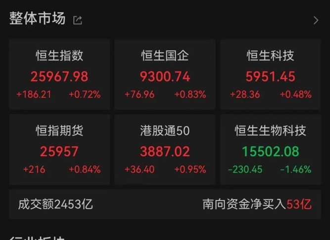 截至收盘,恒生指数上涨0.72%,恒生科技指数上涨0.48%,恒生中国企业指数上涨0.83%。